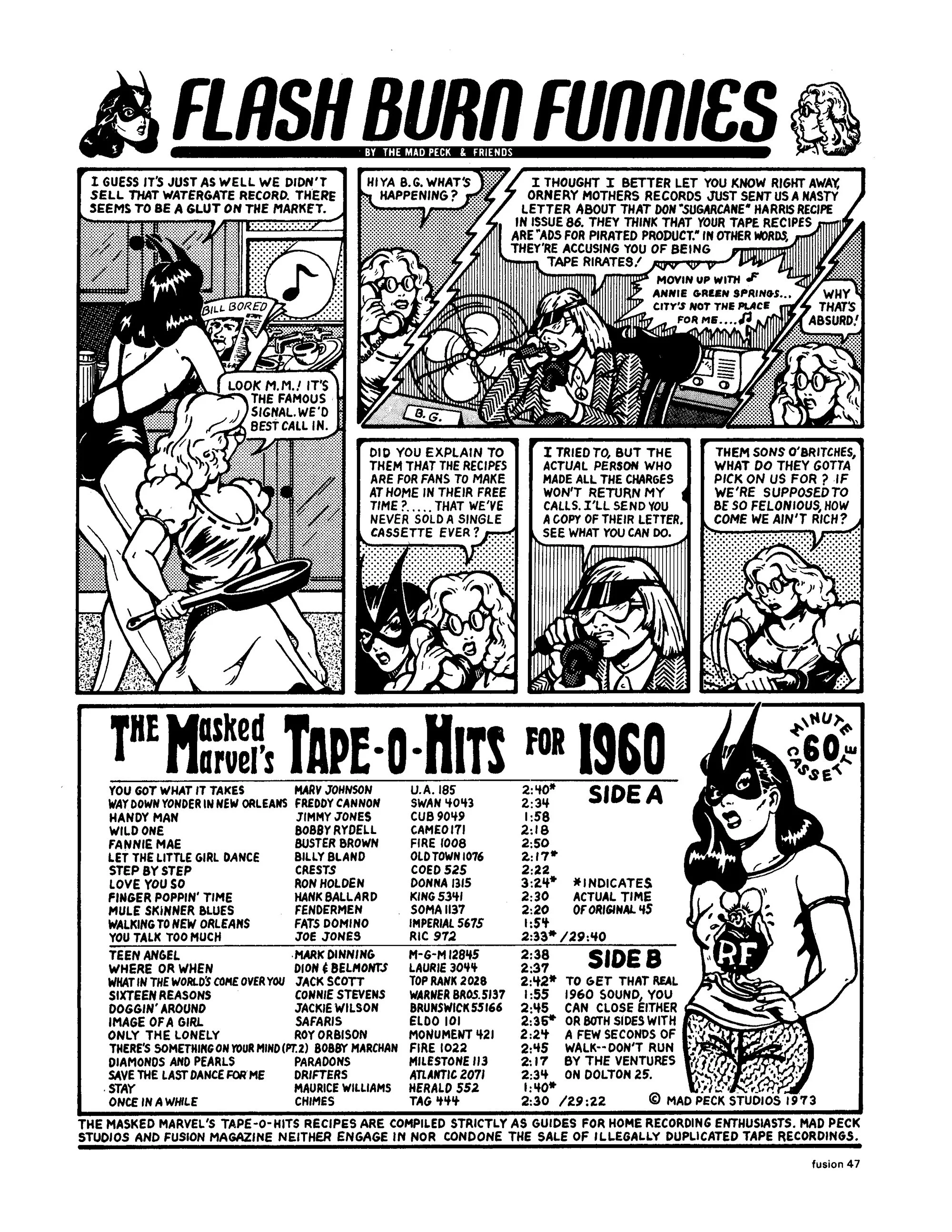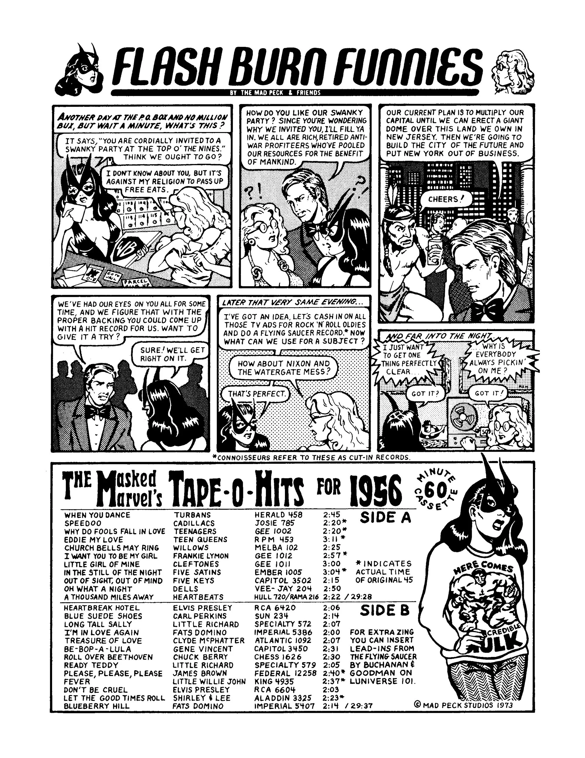 The “burning” questions persists: did The Mad Peck, way back in 1972 create, in the pages of Fusion magazine, the concept of the “mix tape”? The magnetic audio cassette tape was a relatively new item at that time, reaching market dominance by the late 1960s and Peck and his pals meticulously selected collections of record singles to compile lists timed to fill out cassette sides. In addition, Peck drew a “topper” strip, starring the Masked Marvel and I.C. Lotz, which often guest-starred pop culture icons. The full-pagers lasted ’til the mag’s demise in ’74 (Select image to enlarge).
